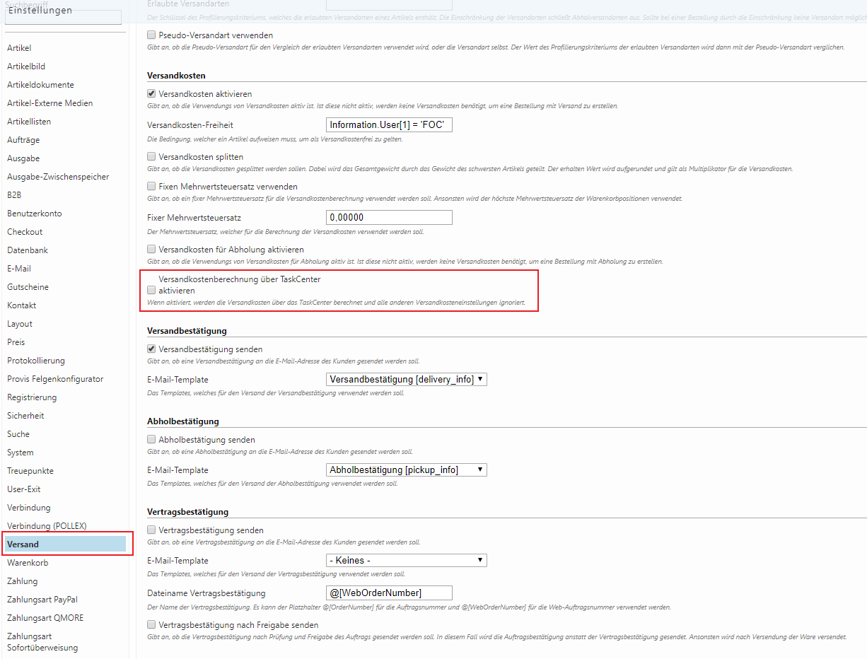 Im Webshop gibt es die Möglichkeit, die Versandkostenberechnung des TaskCenters zu verwenden.