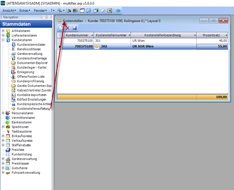 Bei der prozentualen Aufteilung auf zwei oder mehr Kostenstellen muss durch die hinterlegende Person sicher gestellt werden, dass die Einträge 100% ergeben. Hierbei ist keine Programmfunktion hinterlegt, welche prüft, ob tatsächlich 100% eingegeben wurden. Ergibt die Summe je Kunde nicht 100%, dann kommen falsche Werte in die Überleitungsdatei.