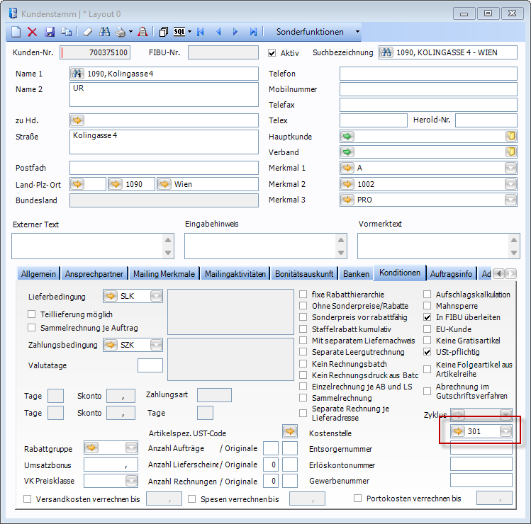 Im Kundenstamm (Stammdaten - Kundenstamm - Kundenstammdaten) im Feld Kostenstelle kann ein Eintrag für eine Kostenstelle je Kunde getroffen werden.