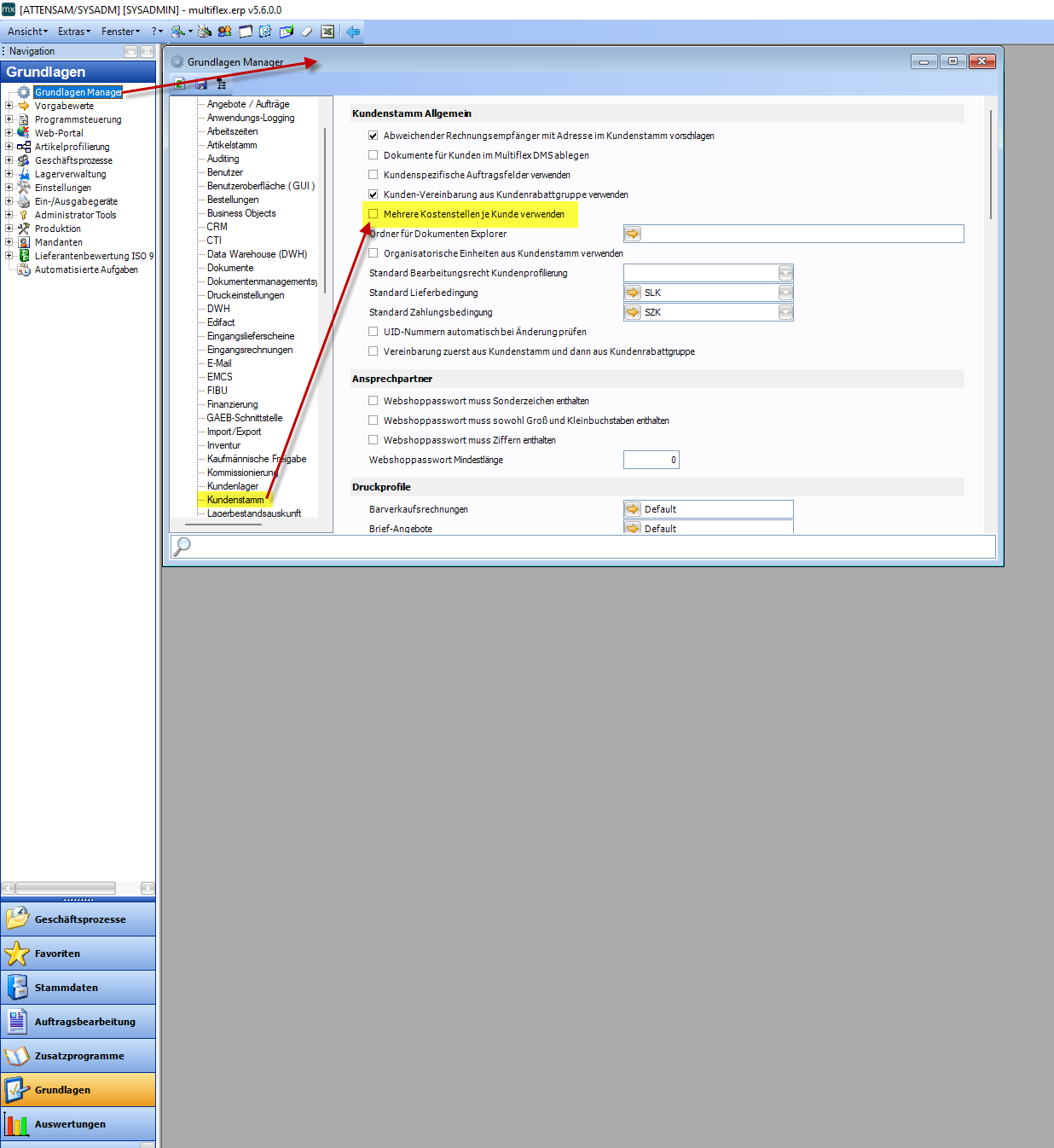 Um die Kostenstellenaufteilung je Kunde auf mehrere Kostenstellen zu ermöglichen muss der entsprechende Grundlagenschalter aktiviert werden. Sobald im Grundlagen Manager (Grundlagen - Grundlagen Manager) der Haken "Mehrere Kostenstellen je Kunde verwenden" (Menüpunkt Kundenstamm - Unterpunkt Kundenstamm Allgemein) aktiviert ist kann das Fenster Kostenstellenaufteilung aufgerufen werden.