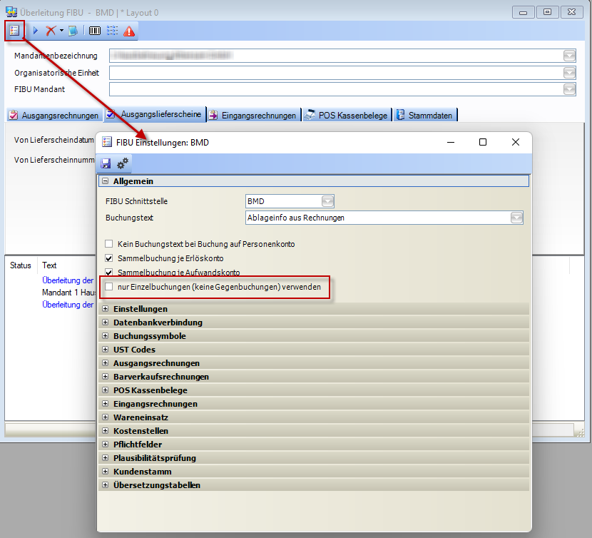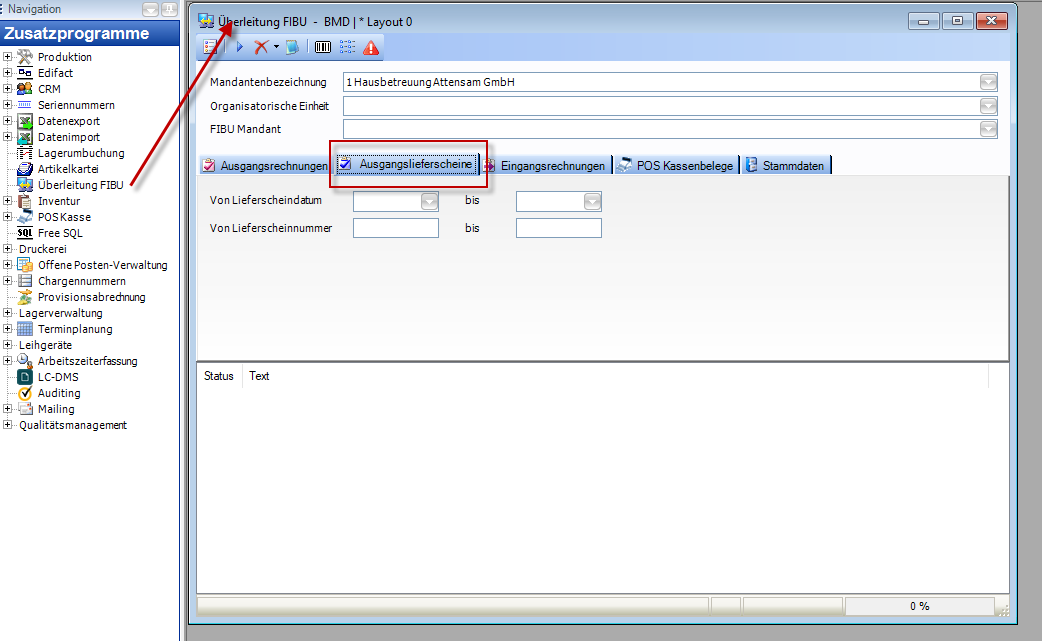 Im Fenster Überleitung FIBU zu finden unter Zusatzprogramme - Überleitung FIBU. Gibt es eine Registerkarte "Ausgangslieferscheine". Auf dieser Registerkarte können die Wareneinsatzbuchungen für Lieferscheine als Datei für den Import in die BMD exportiert werden.