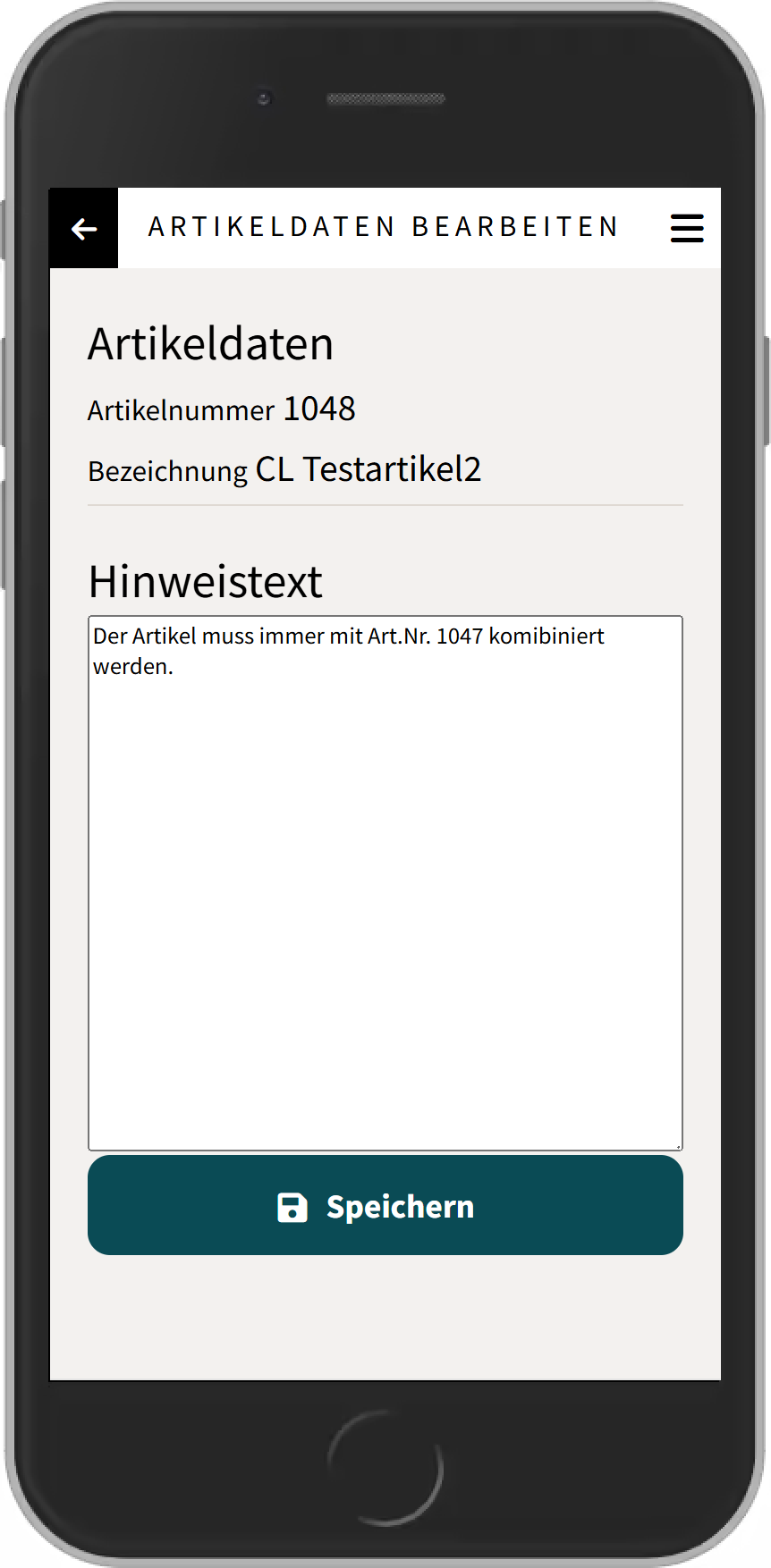 Dieser wird automatisch angezeigt, sofern dem ausgewählten Artikel ein entsprechender Hinweistext zugeordnet ist. Die Bearbeitung des Textes erfolgt über das Kontextmenü.
