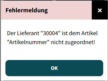 Ist der Artikel dem Lieferanten nicht zugeordnet, erscheint folgende Meldung: