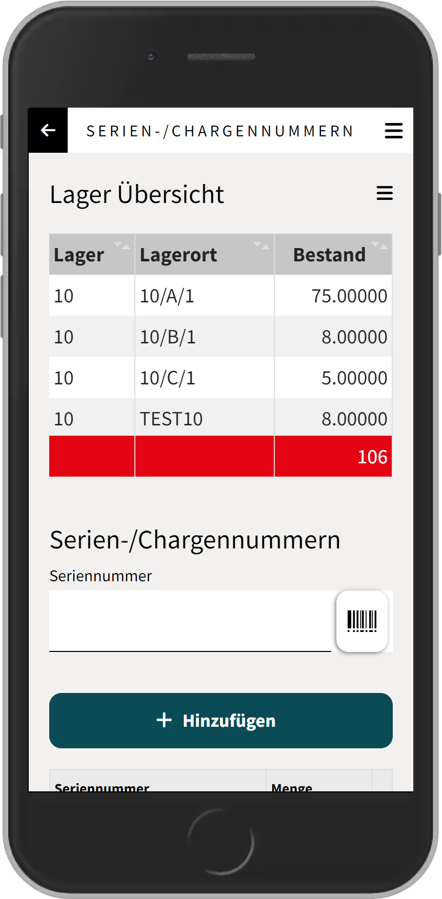 Sollte ein serien- oder chargenpflichtiger Artikel gefunden worden sein, dann wird eine Eingabe für die Seriennummer bzw. die Chargeninformationen angezeigt.