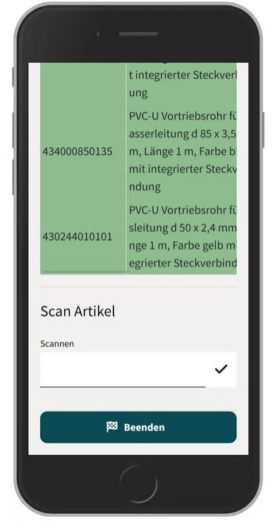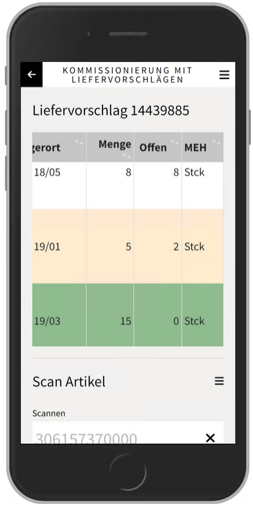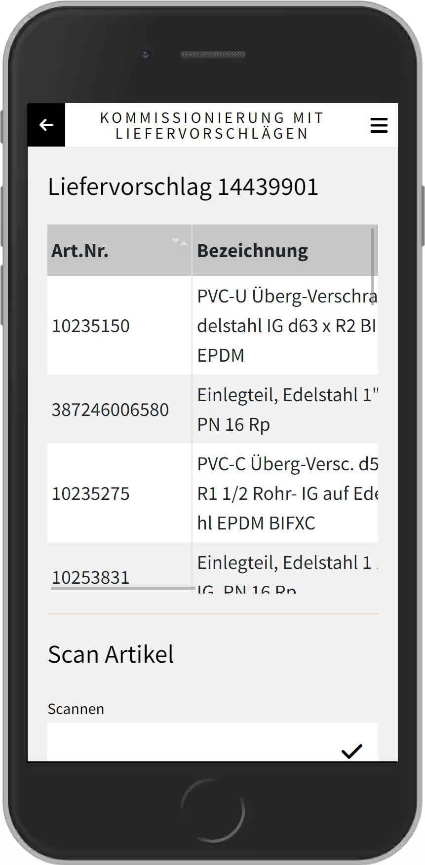 Unter "Scan Artikel" können nacheinander die Artikelnummern gescannt oder eingeben werden, um die Kommissionierung durchzuführen.