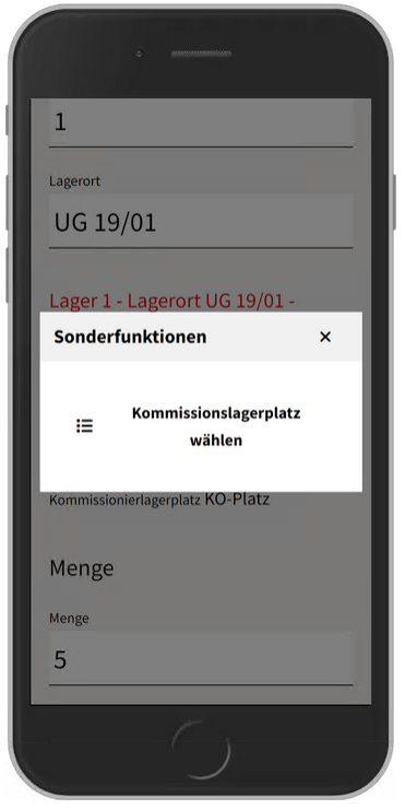 Der Kommissionslagerplatz kann während der Kommissionierung noch geändert werden, indem nach dem Scan eines Artikels im Abschnitt "Kommissionslagerplatz" das Kontextmenü