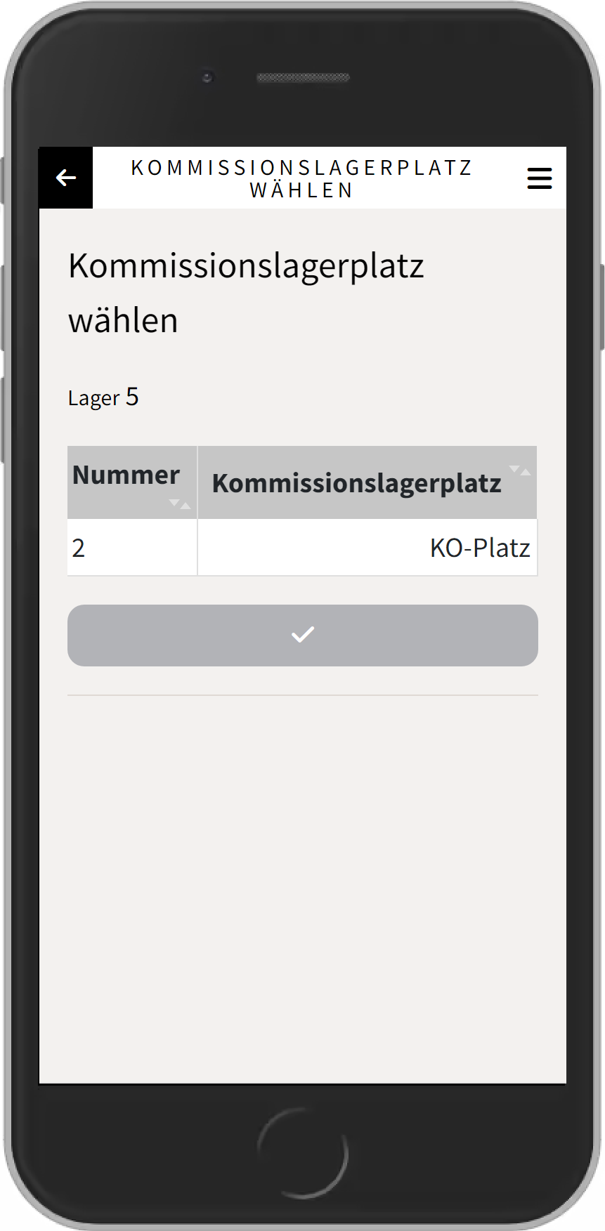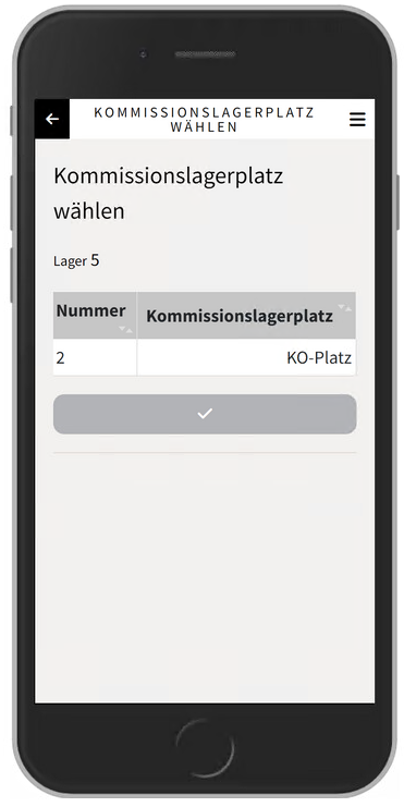 Damit wird man auf das Fenster weitergeleitet, auf dem alle verfügbaren Kommissionslagerplätze für das gegebene Lager angezeigt werden. Falls zuvor noch kein Lager ausgewählt bzw. in den Einstellungen konfiguriert wurde, muss zunächst noch ein Lager ausgewählt werden. Nach der Auswahl eines Kommisionslagerplatzes wird wieder auf die Hauptseite zurückgeleitet.