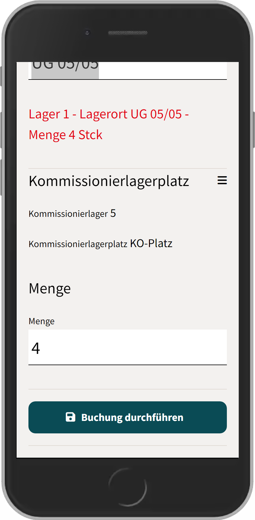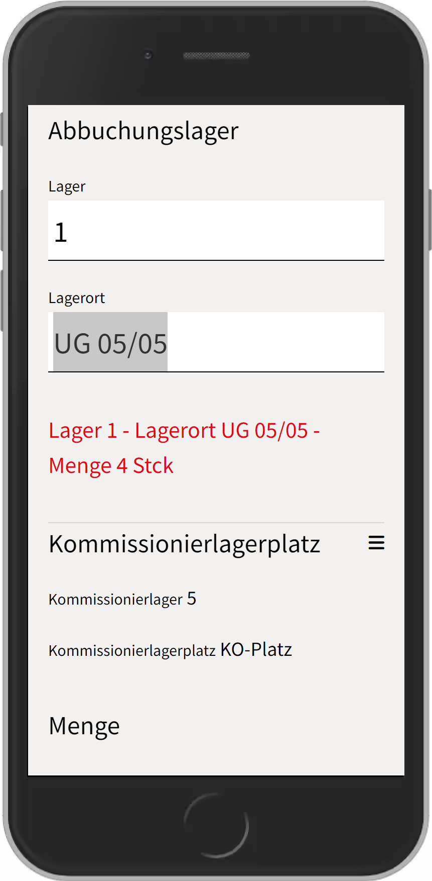 Es werden einerseits Artikeldaten aufgelistet, Informationen zum Abbuchungslager und zum Kommissionslagerplatz angezeigt, und anschließend kann die entsprechende Menge für diesen Artikel eingeben werden.