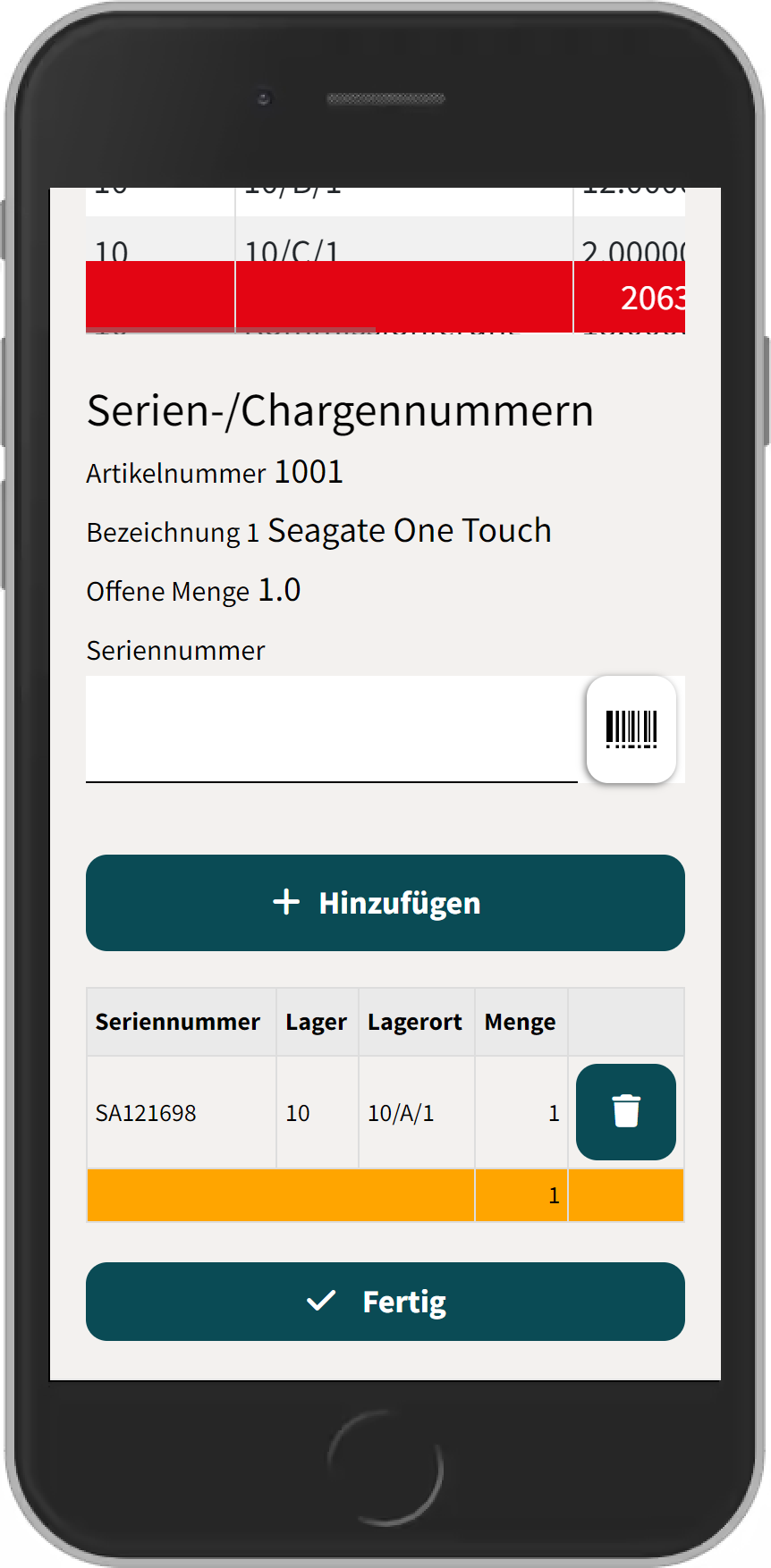 Anschließend gelangt man wieder in die Hauptansicht. Wenn ein Artikel nicht vollständig gescannt wurde, dann werden diese in der Tabelle Orange markiert.