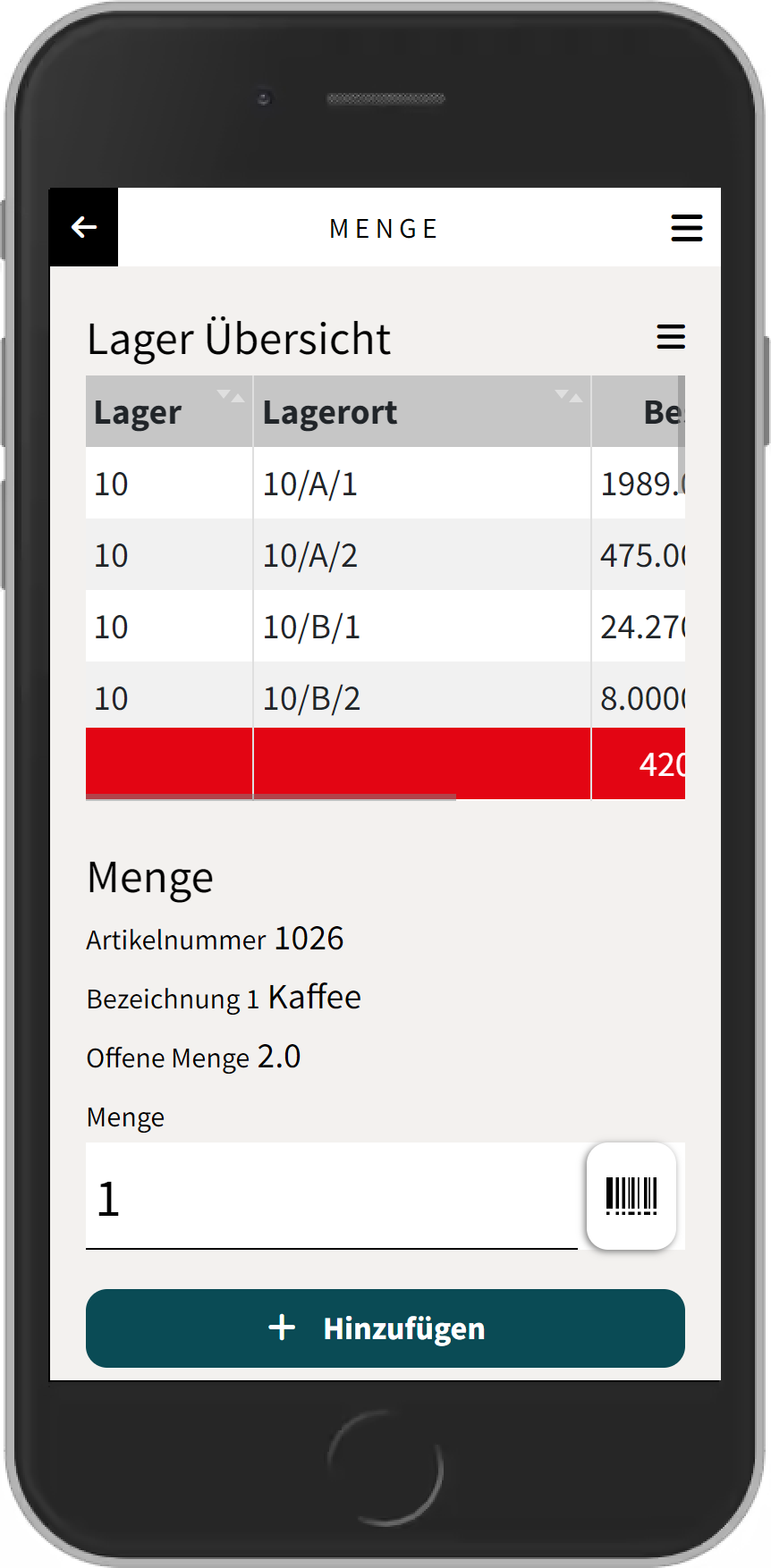 Danach gibt man die Menge ein, welche man vom zuvor gescannten Lager / Lagerort entnehmen möchte (Bild links). Handelt es sich um einen Artikel mit der Eigenschaft “Serienpflicht Verkauf”, dann muss die jeweils entnommene Seriennummer gescannt werden (Bild rechts).