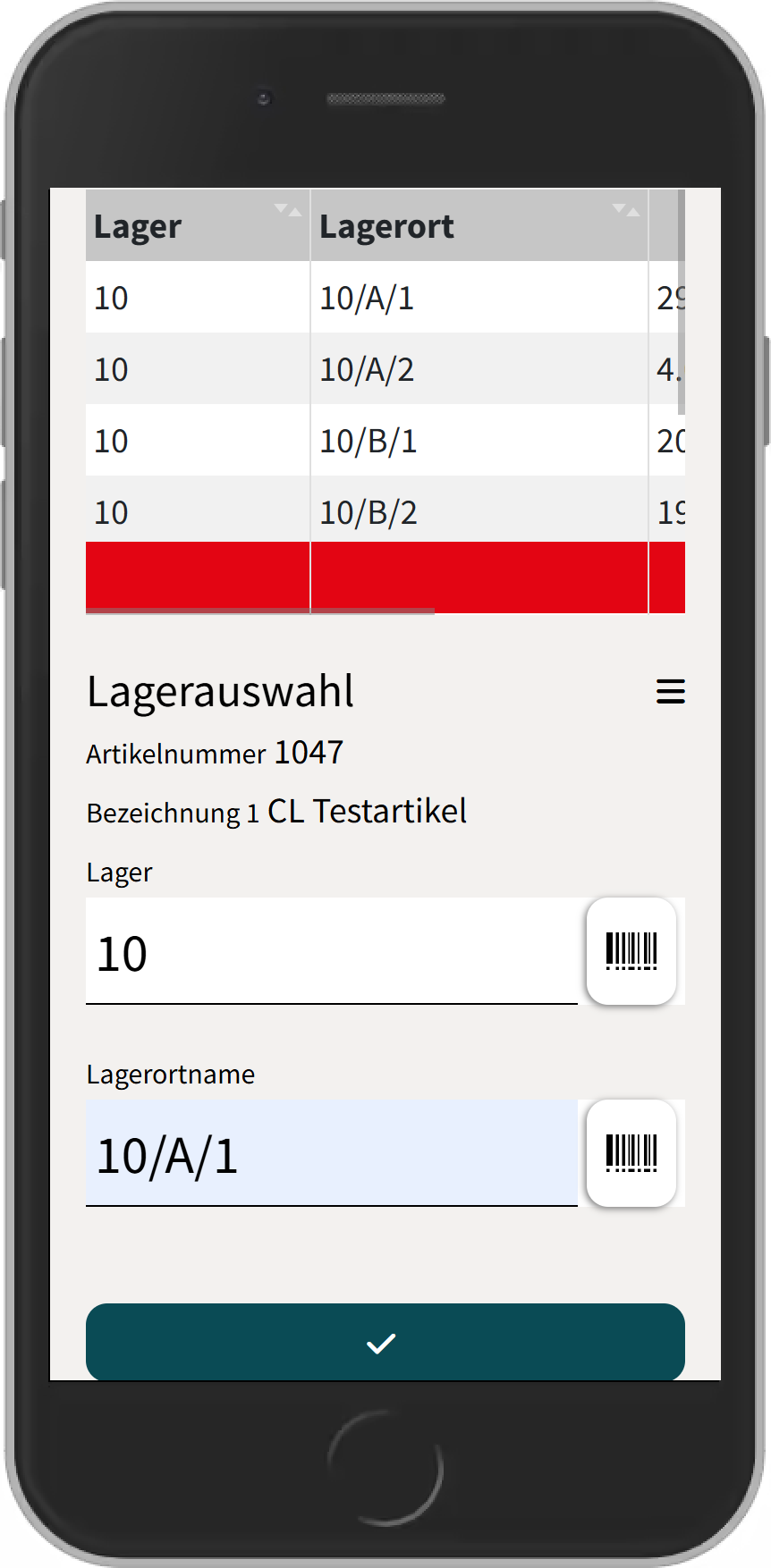 Als nächstes werden das Lager und der Lagerort erfasst, um den gescannten Artikel einem Lagerort zuzuweisen.