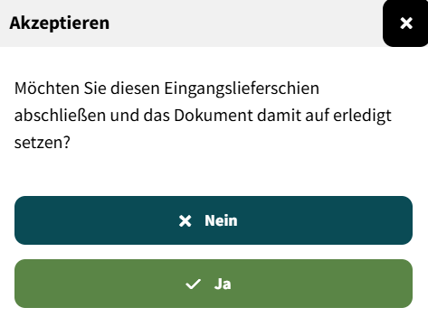 Mit Klick auf den Finish-Button kann der Eingangslieferschein abgeschlossen und das Dokument damit auf "erledigt" gesetzt werden