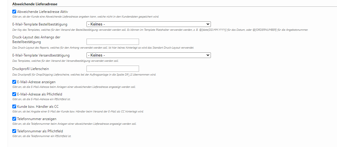 Es kann das Druck-Layout für Bestellbestätigungen wie auch das Druckprofil für Lieferscheine eingestellt werden.