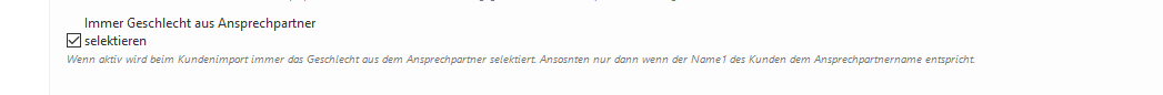 Standardmässig wird beim Kundennimport das Geschlecht aus Ansprechpartner beim Import nur verwendet wenn KUNDEN.NAME1 mit der Kombination von Ansprechpartner Vorname und Nachname endet.