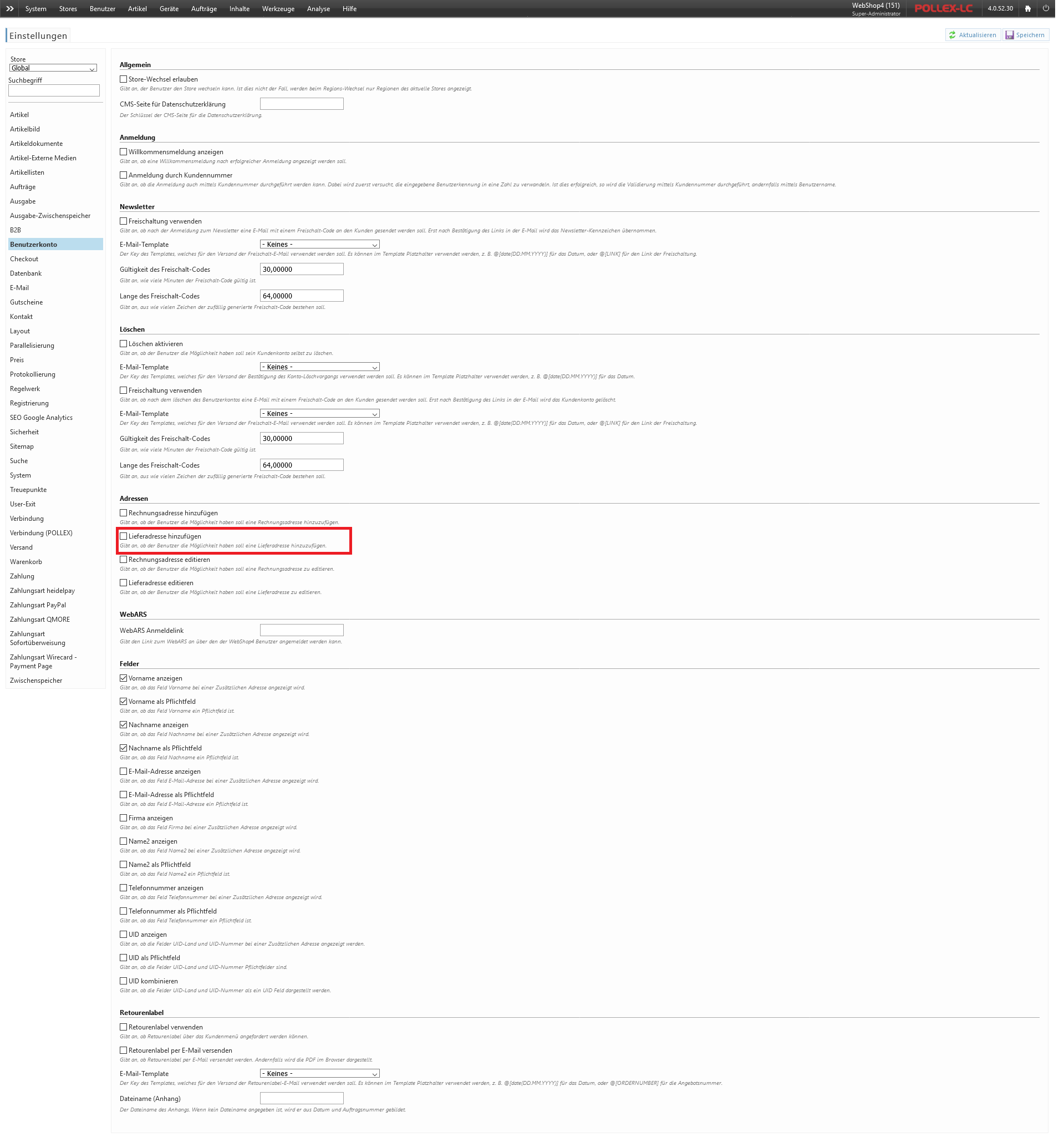 Um das Anlegen von zusätzlichen Lieferadressen für Kunden für einen Store zu aktivieren gehen Sie im Backend auf System → Store Einstellungen. wählen Sie anschließend Global oder den betroffenen Store aus. Wechseln Sie in den Tab Benutzerkonto und aktivieren Sie die Einstellung Lieferadresse hinzufügen