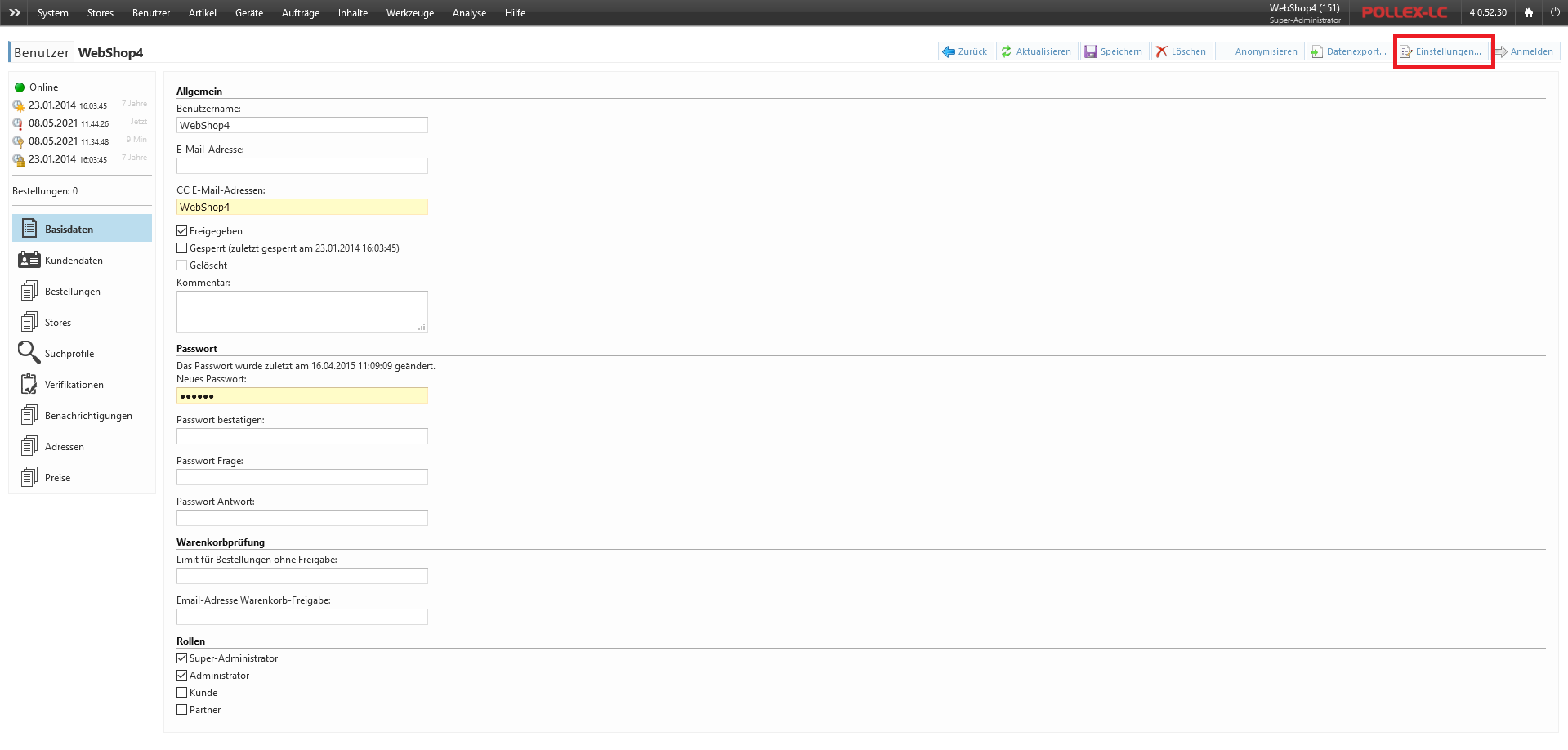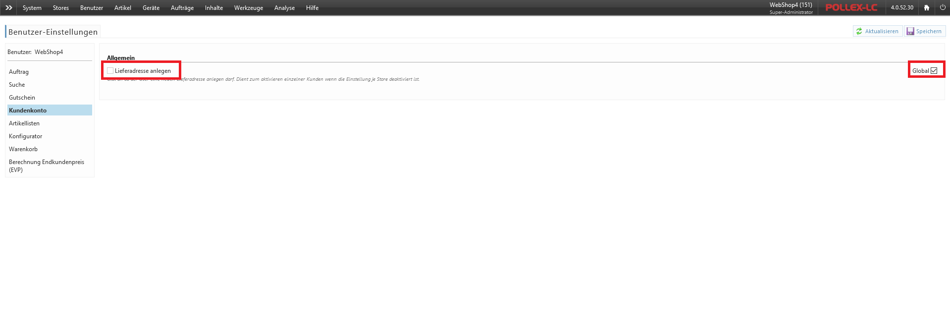 Wenn Sie das Anlegen einer zusätzlichen Lieferadresse nur für bestimmte Benutzer aktivieren möchten gehen Sie im Backend auf Benutzer → Übersicht. Wählen Sie den betroffenen Benutzer aus. Drücken Sie rechts oben auf Einstellungen. Wählen Sie im Einstellungsfenster den Tab Kundenkonto. Deaktvieren sie bei der Einstellung Lieferadresse anlegen rechts die Eigenschaft Global und aktivieren anschließend die Einstellung