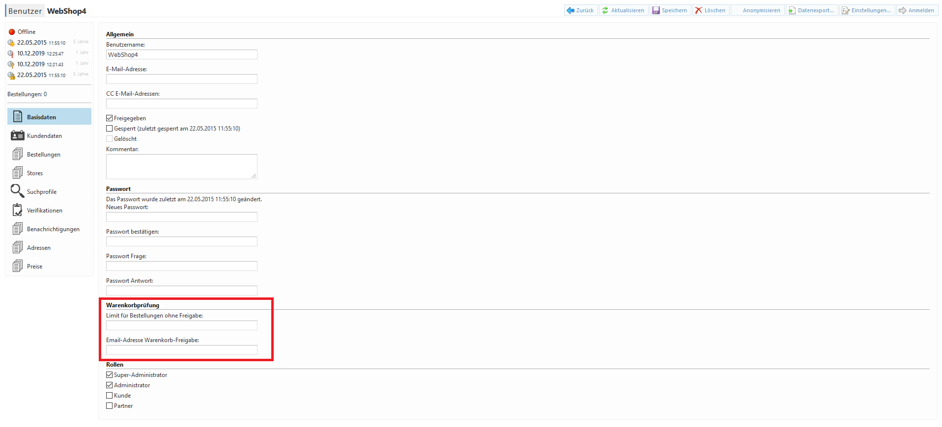 Je Kunde (User im Webshop) ist einstellbar, ab welchem Warenkorbbetrag eine Freigabe erforderlich ist.
