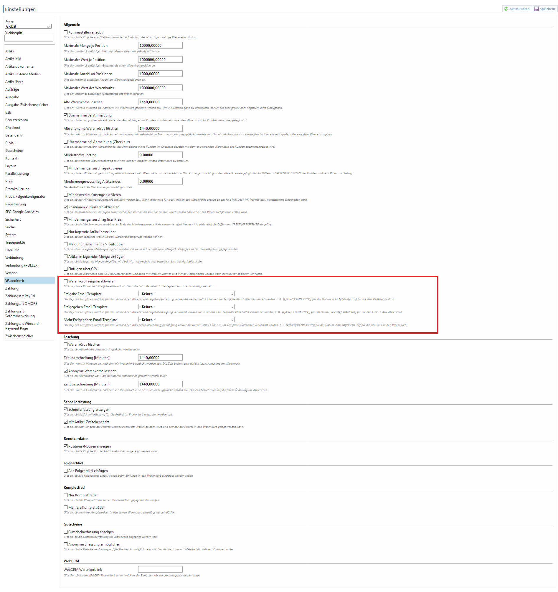 Warenkorbfreigaben Funktionsbeschreibung
