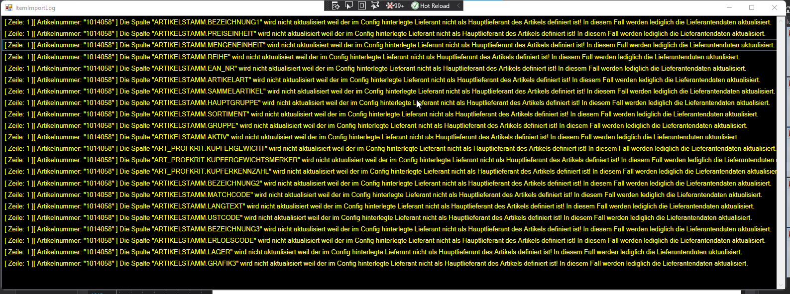 Wenn definierter Lieferant nicht Hauptlieferant ist, nur die Lieferantendaten aktualisieren | Checkbox | Ist der in der Kartei "Lieferant" eingetragene Lieferant beim Artikel nicht als Hauptlieferant hinterlegt, werden bei aktiver Checkbox nur die Lieferantendaten (Tabelle ALIEF) aktualisiert. Ist die Checkbox nicht gesetzt werden auch sämtliche Artikelstammdaten aktualisiert. Im ItemImportLog werden die betroffenen Artikel mit den Spalten entsprechend aufgelistet: ![]() |