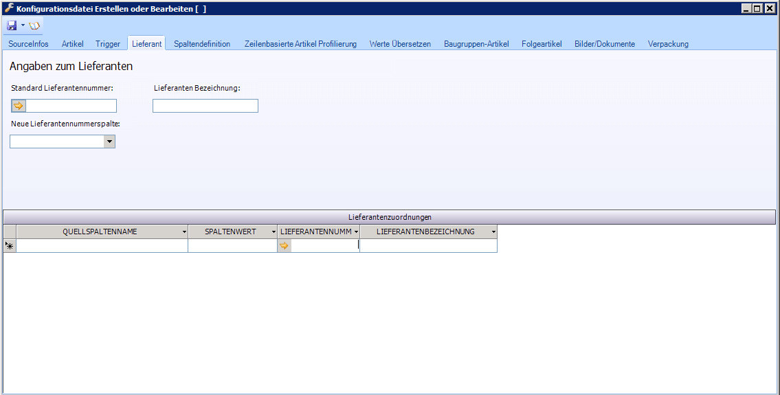 Spaltenwert | Eingabefeld | Hier kann ein bestimmter Spaltenwert eingetragen werden. Wenn dieser Spaltenwert in der Spalte gefunden wird, dann wird der im Feld "Lieferantennummer" eingetragenen Lieferant zu diesem Datensatz gewählt. |