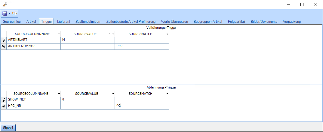 Wie im Beispiel ersichtlich wurden zwei Validierungs-Trigger und zwei Ablehnungstrigger angelegt. Der erste Validierungstrigger prüft ob die Artikelart "M" ist, der Zweite prüft, ob die Artikelnummer mit dem Wert "99" beginnt. Die beiden Ablehungstrigger prüfen, ob die Eigenschaft SHOW-NET gleich "0" ist und die Hauptgruppennummer mit "2" beginnt.