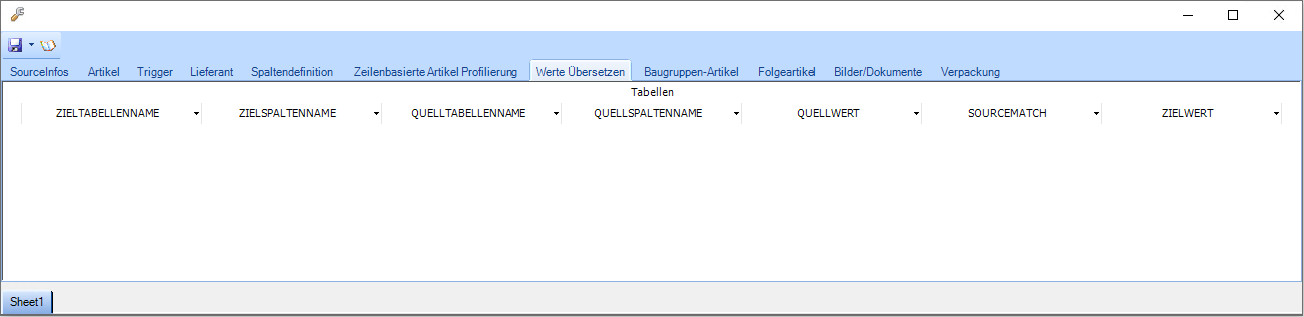 Quelltabelle | Eingabe-/Auswahlfeld | Hier kann angegeben werden, welches Tabellenblatt der Quelldatei gelesen werden soll. Ist eine Quelldatei als Grundlage für die Konfigruation geladen, kann die Quell-Tabelle ausgewählt werden, ansonsten muss der Wert eingetragen werden. Hat die Quelldatei nur ein Tabellenblatt kann dieses Feld leer bleiben. |