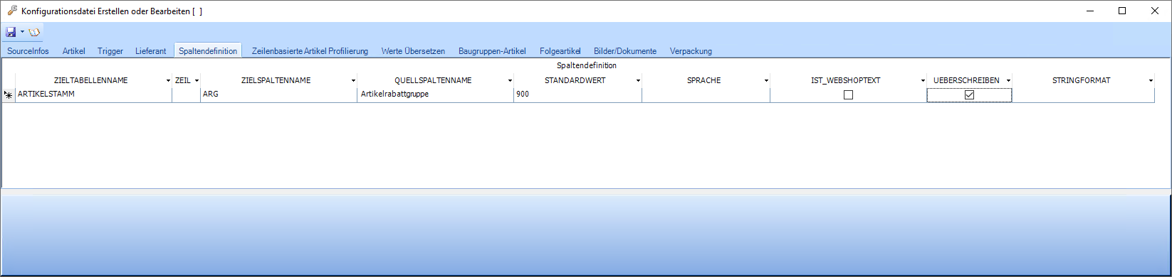In der oben ersichtlichen Zeile wird definiert, dass der Wert aus Spalte "Artikelrabattgruppe" aus der Datendatei in die Tabelle ARTIKELSTAMM, Spalte ARG eingelesen wird. Wenn dieser Wert in der Datendatei leer ist, dann wird stattdessen der Standardwert "900" verwendet. Da der Haken "Überschreien" aktiviert ist, wird der aktuell in der Datenbank zu diesem Datensatz gespeicherte Wert mit jenem aus der Datendatei überschrieben.