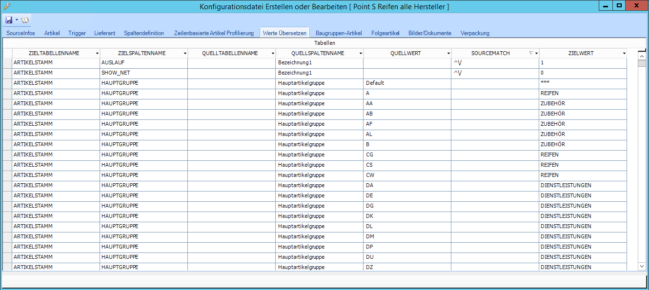 Wird in der Spallte Haupartikelgruppe der Wert "A" gefunden, dann wird der Wert "REIFEN" in die Datenbank in die Spalte Hauptgruppe im Artikelstamm eingetragen (Zeile 4).