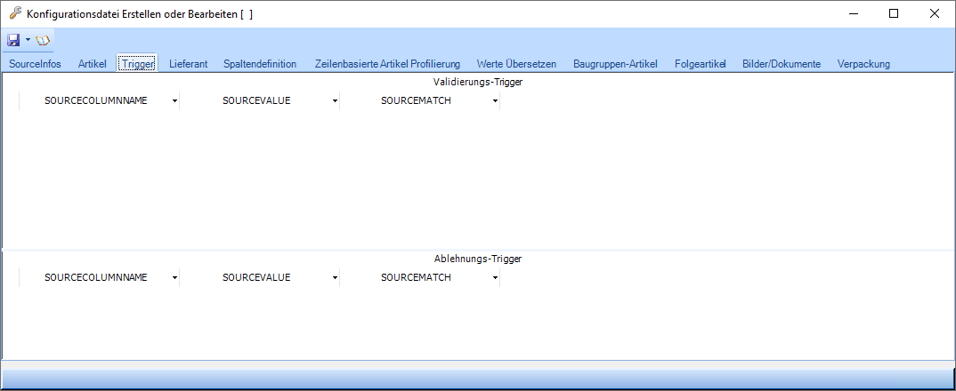 auf dieser Karteikarte können Überprüfungen für die einzulesenden Daten angelegt werden. Hierfür gibt es Validierungs- und Ablehnungstrigger. Wenn der Validierungs-Trigger zutrifft, dann ist der Datensatz gültig und wird eingelesen. Es müssen ALLE Validierungs-Trigger zutreffen, damit ein Datensatz gültig ist und somit eingelesen wird. Wenn ein Ablehnungs-Trigger auf einen Datensatz zutrifft, dann wird der Datensatz abgelehnt und somit nicht eingelesen. Sobald EIN Ablehnungstrigger auf einen Datensatz zutrifft, wird dieser nicht eingelesen.