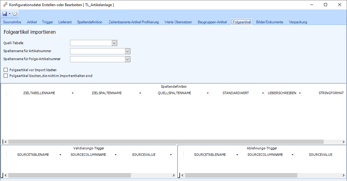 Spaltenname für Folge-Artikelnummer | Eingabe-/Auswahlfeld | Hier wird der Spaltenname für die Folge-Artikelnummer aus der Quelldatei eingetragen, Ist eine Quelldatei geladen, kann der Spaltenname aus der Liste ausgewählt werden. |