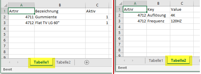 Oben ersichtlich ist eine Beispiel-Quelldatei. In Tabelle 1 der Quelldatei ist ersichtlich welche Artikel grundsätzlich angelegt bzw. verändert werden. Hier werden wie bei einer Standard-Artikelanlage die Artikel je einmal definiert und können in der selben Konfiguration angelegt oder verändert werden. In Tabelle 2 wird definiert, welcher Artikel welchen Profilierungswert bei welchem Profilierungskriterium bekommt. Da der erste Artikel "Gummiente" keine technischen Daten aufweist, bekommt dieser keine Profilierung. Lediglich der zweite Artikel "Flat TV" weist eine Profilierung auf.