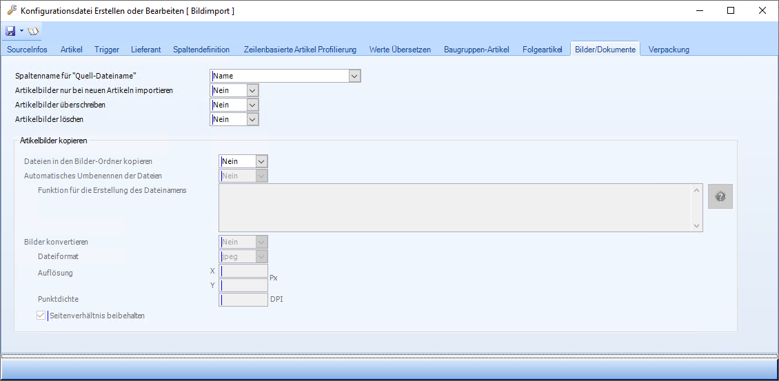Bilder konvertieren | Auswahlfeld | Hier kann angegeben werden, ob die Bilder mit bestehenden Dateiformaten kopiert werden sollen, oder konvertiert werden sollen. Wird JA ausgewählt und die Bilder somit konvertiert, dann können die folgenden Einstellungen verwendet werden. |