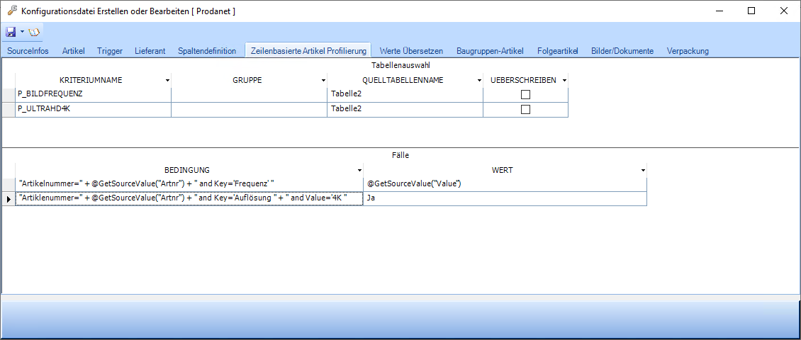 Es wird also in der Bedingung in der ersten Zeile die Artikelnummer über die Spalte "Artnr" aus der Quelldatei identifiziert und nach einem Eintrag "Frequenz" in der Spalte "Key" gesucht. Wird eine solche Zeile gefunden, dann wird in weiterer Folge der Wert aus der Spalte "Value" der Quelldatei ausgelesen und gemäß der Definition in der oberen Tabelle dieser Wert beim Profilierungskriterium P_BILDFREQUENZ eingetragen.