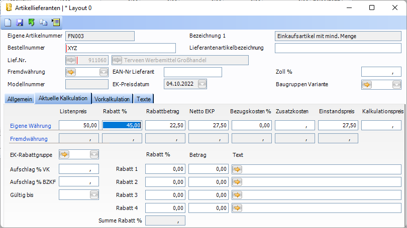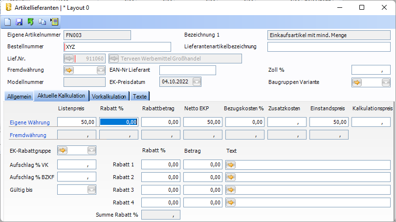 Wird der Rabattsatz (RABATT) geändert, sind die Felder RABATTBETRAG, NETTOPREIS und ESPL im Standardwert mit NULL zu befüllen und Überschreiben zu aktivieren.