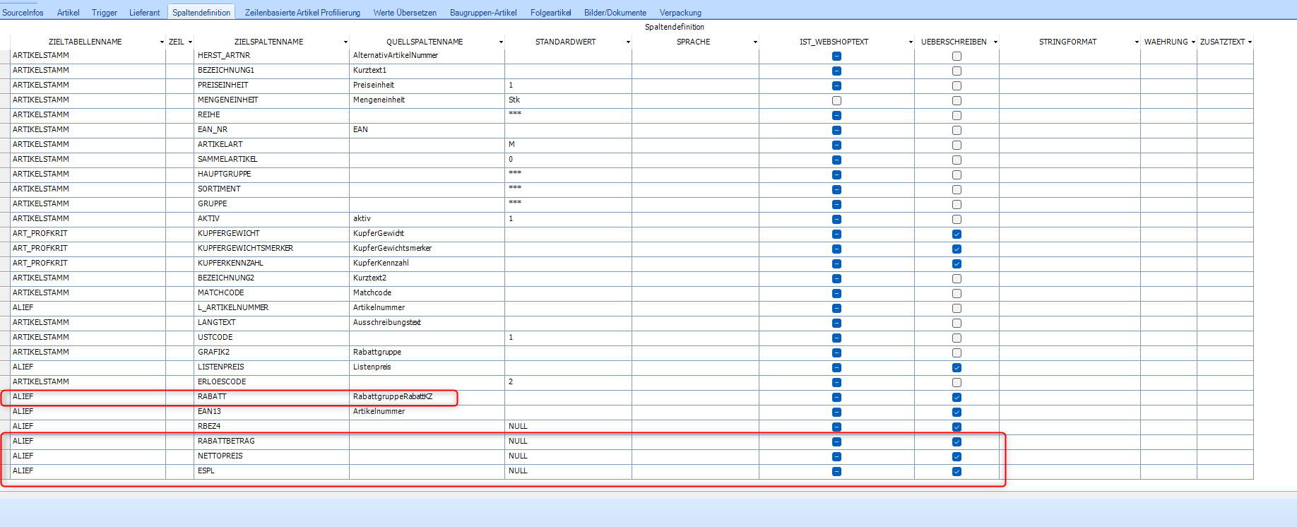Bei Aktualisierung von Rabatten, Rabattbeträgen, Nettopreisen und Einstandspreise der Artikellieferanten ist darauf zu achten, das jeweils automatisch zu berechnenden Spalten im Konfigurator mit NULL befüllt und "ÜBERSCHREIBEN" aktiviert wird.