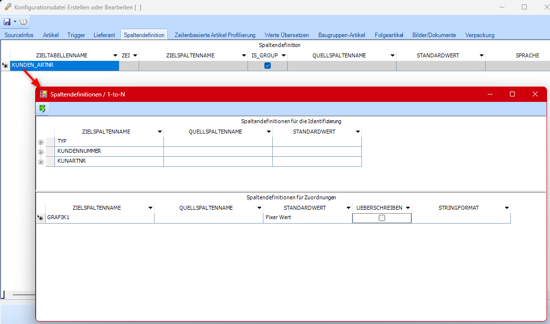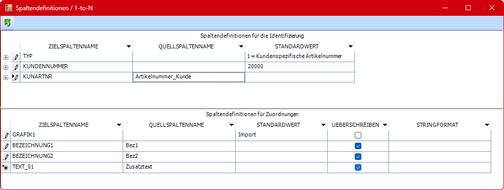 Sobald in den Spaltendefinitionen eine der 1-zu-N-Tabellen ausgewählt wird, muss die Zuordnung in dem 1-zu-N-Fenster durchgeführt werden.