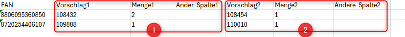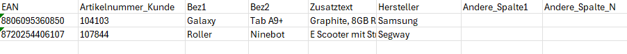 In unserer Quell-Datei haben wir nur eine Gruppe von Spalten, die zu einer (1) Kundenartikelnummer führen.