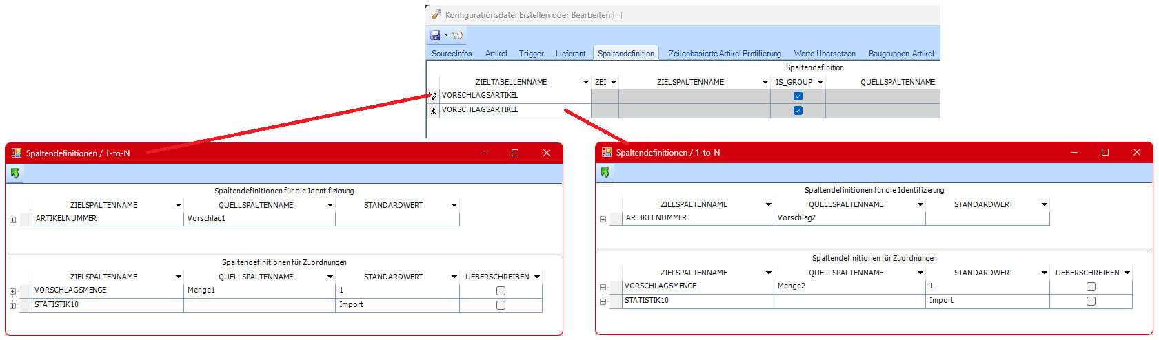 Manche Tabellen (zB. KUNDEN_ARTNR, VORSCHLAGSARTIKEL,....) haben eine 1-zu-N-Beziehung zum Artikelstamm. Das heißt, es können mehrere Einträge pro Artikel zugeordnet werden. In diesem Fall wird die Zuordnung über ein zusätzliches Fenster durchgeführt.