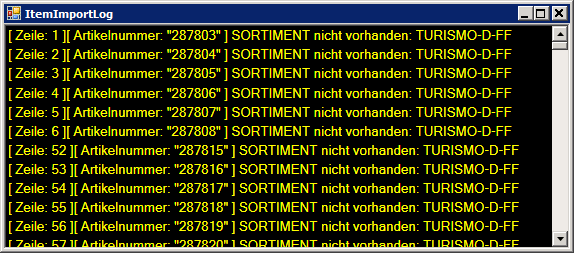 ![]() | Logging-Fenster | Öffnet das Logging Fenster, welches grundsätzlich nach jeder Konvertierung ebenfalls automatisch geöffnet wird. Hier können etwaige Probleme mit der Konfiguration bzw. den Quelldaten entnommen werden. ![]() In oben ersichtlichem Beispiel ist in den Quelldaten das Sortiment „TURISMO-D-FF" für die Artikel vorgegeben. Dieses Sortiment existiert allerdings in der Datenbank nicht, wodurch dieses beim Import auch nicht hinterlegt werden kann. Wird dieses Sortiment auf der Datenbank im Vorfeld angelegt, werden diese Meldungen aus dem Logging-Fenster verschwinden, da dieses anschließend zugeordnet werden kann. |