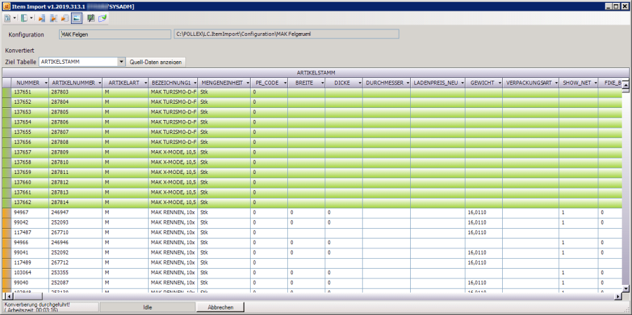 ![]() | Daten konvertieren | Mit dem Punkt „Daten konvertieren" werden die Daten aus der Quelldatei geprüft und anhand der Konfiguration „übersetzt". Es wird nun eine Vorschau angezeigt, welche Daten in welche Tabelle eingelesen werden. ![]() Die grüne Markierung einer Zeile bedeutet, dass ein neuer Datensatz (in diesem Fall – da Ziel-Tabelle der Artikelstamm ist) angelegt wird. Die orange Markierung am Zeilenkopf deutet darauf hin, dass der Datensatz bereits in der Datenbank existiert und nur einzelne Spalten verändert werden. Jene Spalten, die verändert werden, werden ebenfalls orange markiert. |