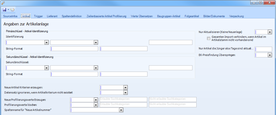 Sekundärschlüssel (Zielspalte) | Auswahlfeld | Analog zur Zielspalte des Primärschlüssels können Sie hier einen weiteren Schlüssel angeben, sollte der Primärschlüssel gar nicht oder mehrfach vorhanden sein. In diesem Fall wird versucht den Artikel über den Sekundärschlüssel zu identifiezieren. |