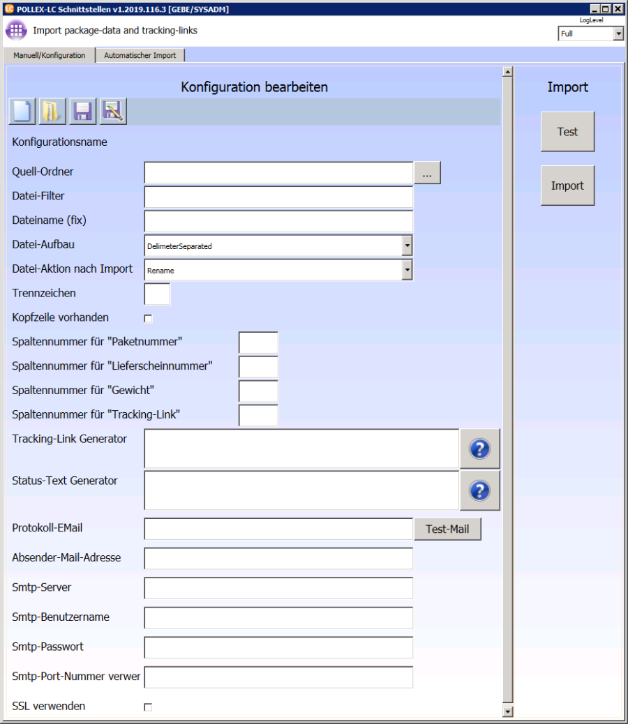 Sobald Sie das Modul Paketdaten Import geöffnet haben, kommen Sie in die Konfigurationsoberfläche. Auf der Karteikarte Manuell/Konfiguration geben Sie die Variablen zur Steuerung des Imports an.