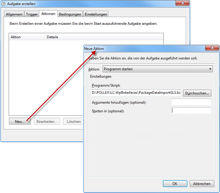 Sobald die Konfiguration eingerichtet und getestet ist, kann der Import der Paketdaten auch automatisiert werden. Hierfür muss eine Batch-Datei erstellt werden und ein Aufruf in der Windows-Aufgabenplanung angelegt werden.