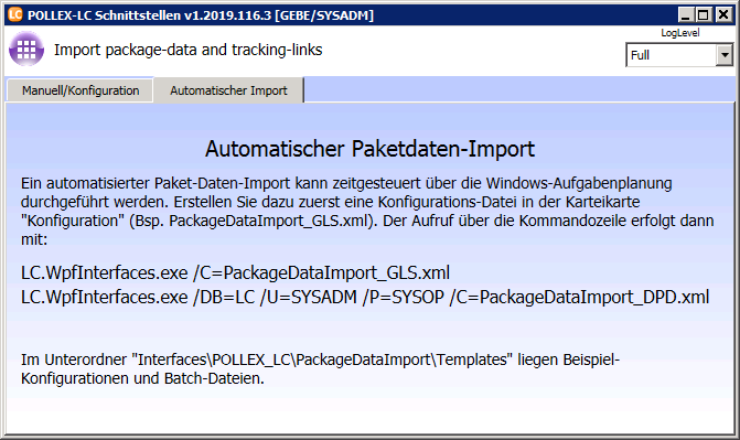 Sie finden auf der Konfigurationsseite des Paketdatenimportes im LC.WpfInterfaces eine zweite Karteikarte Automatischer Import. Hier finden Sie ebenfalls den Hinweis zur Vorgehensweise.