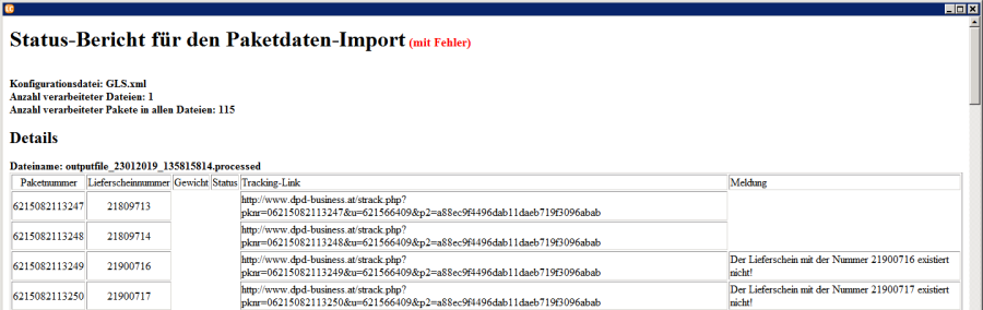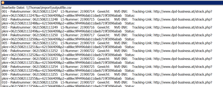 Im Ausgabe-Fenster wird nun angezeigt welche Paketnummer, welche LS-Nummer, welches Gewicht und welcher Tracking-Link eingelesen werden würde, würde man die Datei nun direkt importieren. Es wird beim Test bereits in der Datenbank geprüft, ob es für die Kombination aus Paketnummer und LS-Nummer bereits einen Eintrag gibt. Gibt es noch keinen Eintrag, wird im Test das Feld NVE-INX leer ausgegeben, gibt es bereits einen Eintrag wird hier der bereits bestehende NVE-INX ausgegeben und beim Import der bestehende Datensatz aktualisiert anstatt diesen neu anzulegen.
