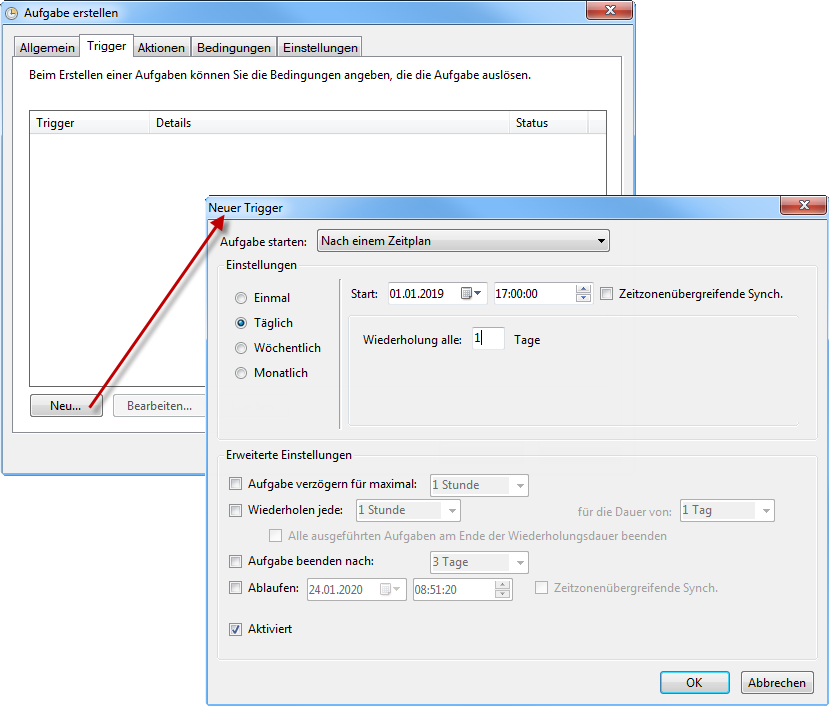 Auf der Karteikarte Trigger können Sie mit „Neu…" eine Zeitsteuerung für die Aufgabe anlegen. Mit den im Screenshot ersichtlichen Einstellungen läuft die Aufgabe seit 01.01.2019 jeden Tag um 17:00 Uhr. Es können selbstverständlich auch andere Einstellungen getroffen werden, falls die Paketdaten häufiger (z.B. mehrmals am Tag, alle 30 Minuten, o.ä.) eingelesen werden sollen.