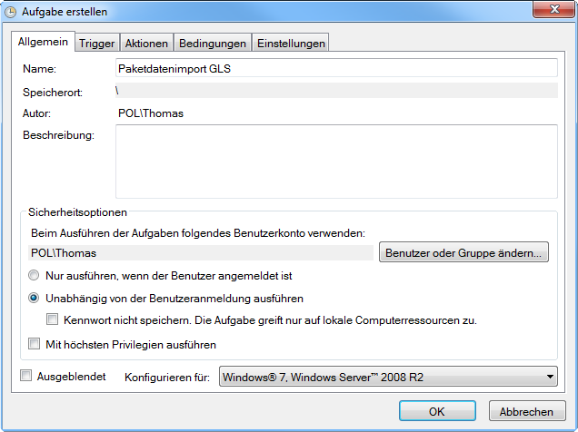 Etwas weiter unten ist standardmäßig „Nur ausführen, wenn der Benutzer angemeldet ist" ausgewählt, dies sollten Sie auf „Unabhängig von der Benutzeranmeldung ausführen" ändern.