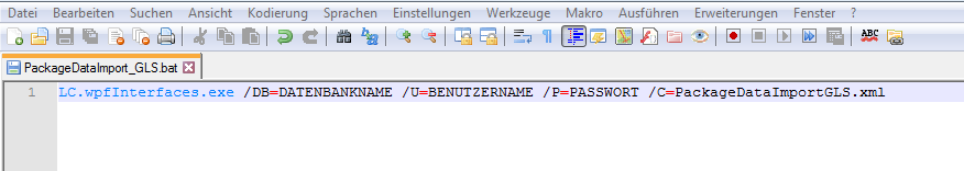 Wenn Sie die Konfigurationsdatei (z.B. PackageDataImportGLS.xml) im Ordner ablegen, wo sich auch die LC.WpfInterfaces.exe befindet, dann könnte die Batch Datei so aussehen: