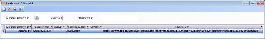 Im TaskCenter sind nun zu diesen beiden Lieferscheinen die Paketstatus verfügbar. Sie finden das Fenster Paketstatus wenn Sie im Fenster Lieferscheine – Sonderfunktionen – Paketstatus auswählen. Im Fall von Lieferschein 21809717 aus obigem Beispiel wurde folgender Datensatz eingelesen: