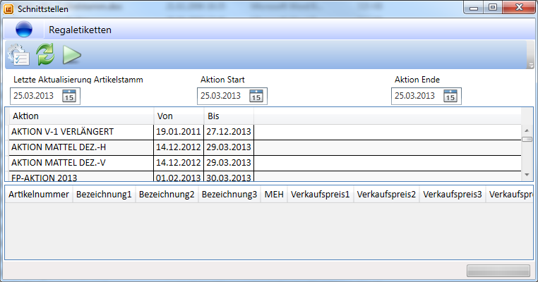 Das Fenster Regaletiketten dient zur schnellen und einfachen Erfassung aller Artikel für die seit dem letzten Druckdatum eine Aktion begonnen oder geendet hat bzw. für welche eine Preisänderung vorgenommen wurde. Es werden ebenso alle aktuell laufenden Aktionen angezeigt. Alle ausgewählten Datensätze können mit einem Knopfdruck automatisch an den Etikettendrucker gesendet werden.